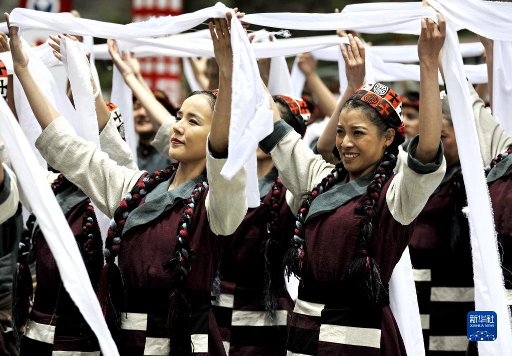 5月31日,演員在隆子縣玉麥鄉(xiāng)文化廣場表演歌舞劇《天邊格?;ā?。新華社記者 劉洲鵬 攝