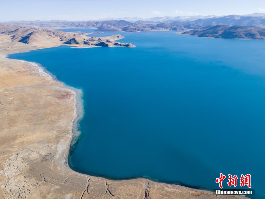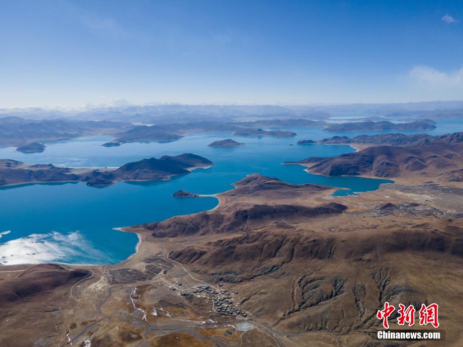 近日,西藏自治區(qū)山南市羊卓雍錯(簡稱羊湖),冬日由于沒有云層遮擋,湖水更顯深藍、孔雀藍。航拍視角下,湖水像巨大的寶石鑲嵌于高原大地,風光壯麗。羊卓雍錯藏語意為“碧玉湖”,湖面海拔4441米,與納木錯、瑪旁雍錯并稱西藏三大“圣湖”。圖為航拍冬日羊卓雍錯。 江飛波 攝