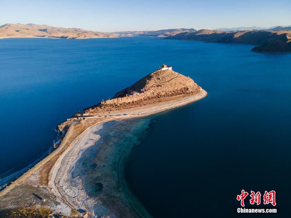 近日,西藏自治區(qū)山南市羊卓雍錯(簡稱羊湖),冬日由于沒有云層遮擋,湖水更顯深藍、孔雀藍。航拍視角下,湖水像巨大的寶石鑲嵌于高原大地,風光壯麗。羊卓雍錯藏語意為“碧玉湖”,湖面海拔4441米,與納木錯、瑪旁雍錯并稱西藏三大“圣湖”。圖為羊湖著名景點日托寺。 江飛波 攝