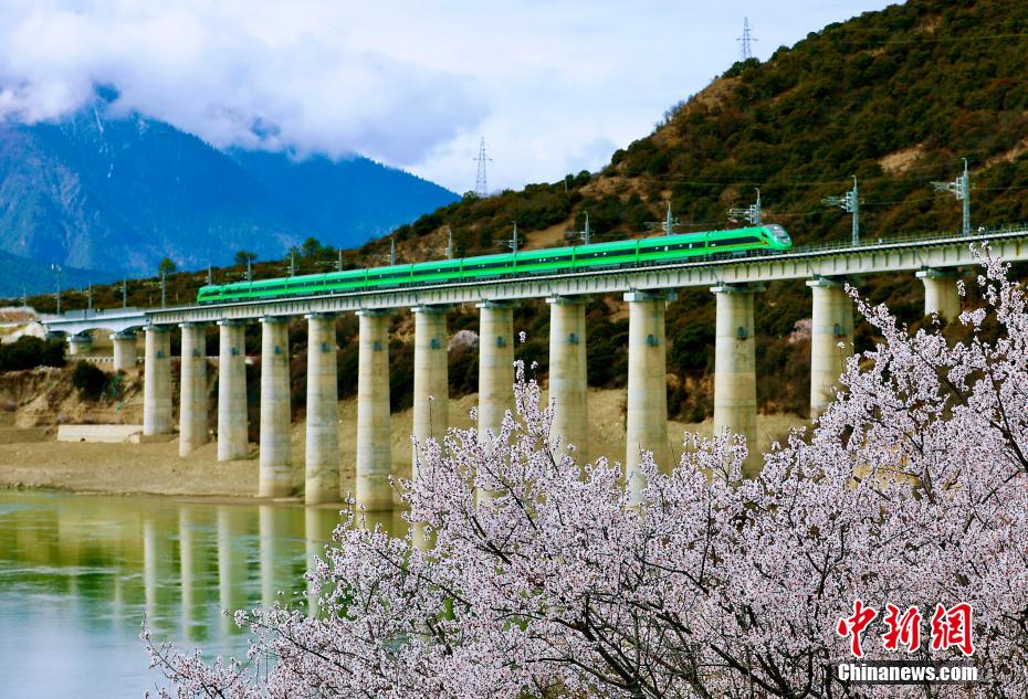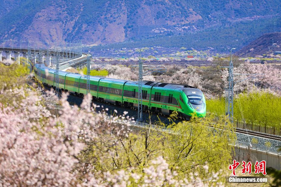 穿梭在桃花林中的拉林鐵路高原復(fù)興號。