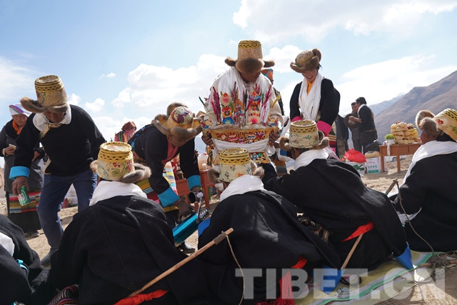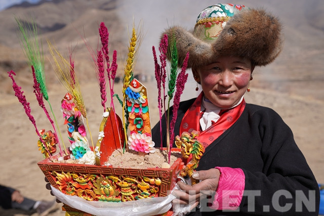 春耕儀式是一個僅次于藏歷新年的重要日子,播撒第一粒種子、給播種者敬獻切瑪?shù)娜诉x是要從家庭和睦、子嗣興旺、品德高尚的村民中嚴格選拔出來的?!扒鞋敽兄惺⒂谐贷溋:汪佤?,插著青稞穗、酥油花,象征著人壽年豐、吉祥如意?!毙疫\兒多吉在田間給播種者們敬獻切瑪。