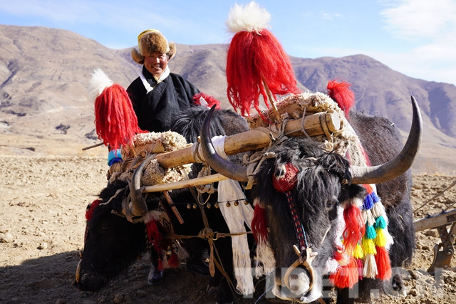 按照習俗,開犁之前村民不僅要給參加開犁的牦牛喂酥油茶、青稞酒,還要在牛角上抹上酥油,經(jīng)過一番“裝扮”后,播種者們揚鞭吆著自己的耕牛,扶著犁頭開始了傳統(tǒng)的“二牛抬杠”耕作模式,锃亮的鐵犁深深地刨開沉睡了一冬的沃土,一幅春早人勤的播綠畫卷正在雪域高原徐徐展開。