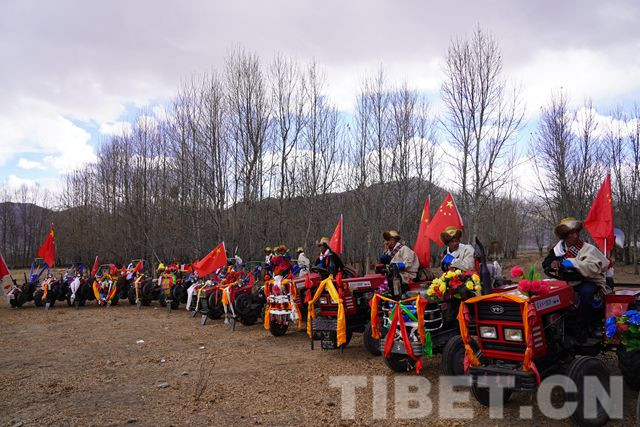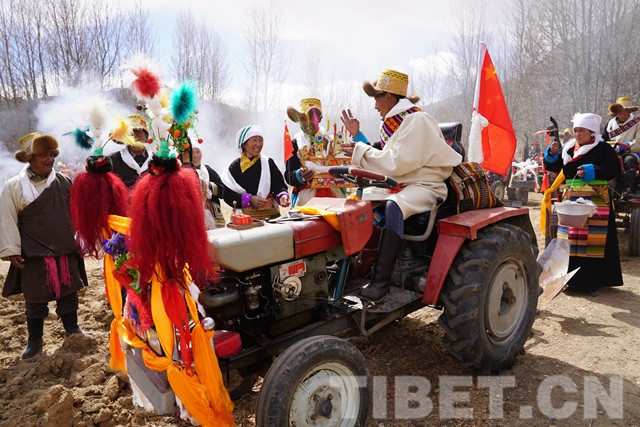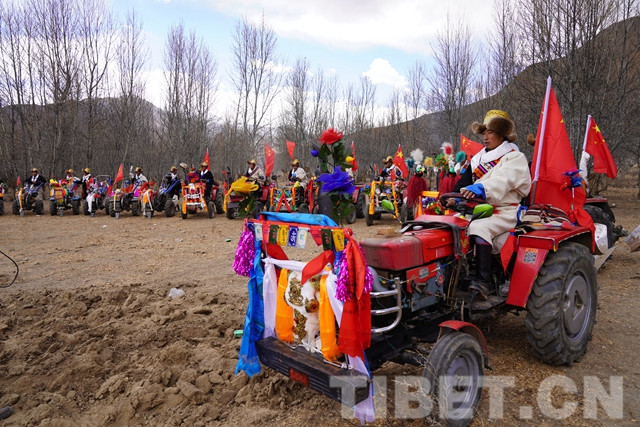 而在克日村的另一塊田地里裝扮的“花枝招展”的18輛“鐵?!币残顒荽l(fā),開犁的第一臺拖拉機更是特別,車頭裝飾除了五彩哈達和花束外還有一牛頭?!耙郧案鞣绞绞嵌LЦ?,現(xiàn)在用拖拉機了,就在車頭前放了牛頭。”耕作方式的變遷、生活的變化并沒有讓他們忘記傳統(tǒng)。