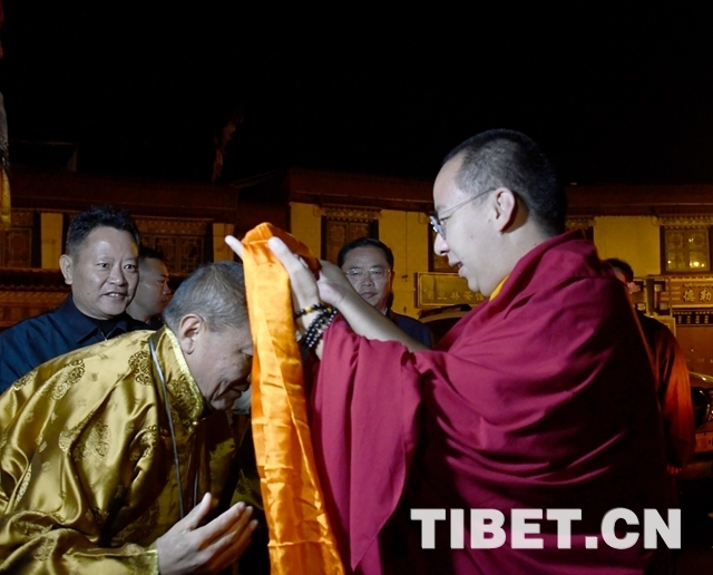 十一世班禪乘車抵達大昭寺時法號齊鳴、鼓樂喧天。早已迎候在此的中國佛協(xié)西藏分會會長珠康?土登克珠向十一世班禪敬獻哈達,表達僧眾對他的衷心擁戴。