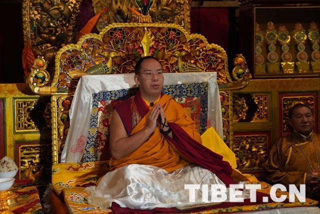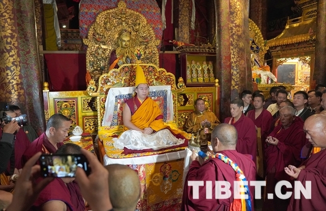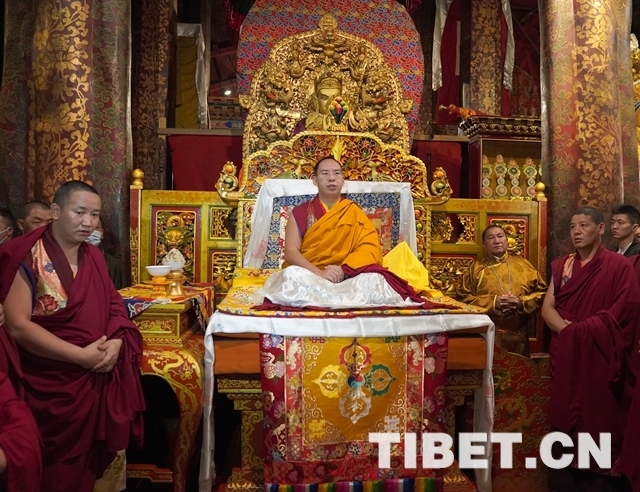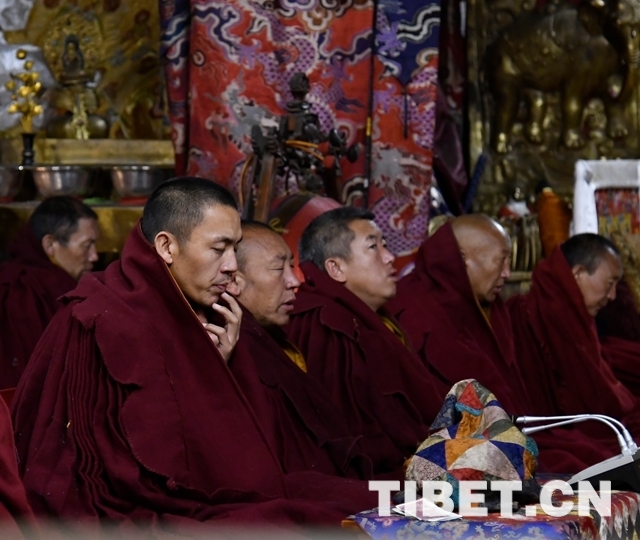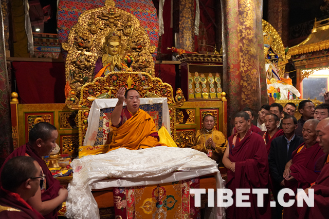 朝拜結束后,十一世班禪登上設在釋迦牟尼佛像正對面的寶座上,面朝佛像,帶領眾僧念誦經文,祈愿五谷豐登、國泰民安、世界和平。