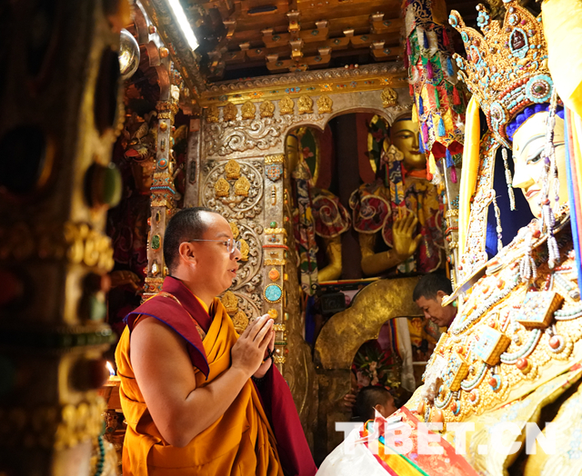 十一世班禪來到釋迦牟尼佛像前,虔誠而莊重地向釋迦牟尼十二歲等身佛像叩頭朝拜,并念誦經文。隨后,十一世班禪手持哈達徐徐走到釋迦牟尼佛像前,雙手合十祈福,向佛像敬獻哈達,并為佛像面部涂繪金粉。