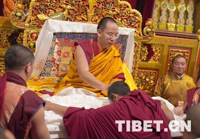圖為按照藏傳佛教傳統(tǒng),大昭寺高僧為十一世班禪敬獻吉祥曼扎等。攝影:王淑。