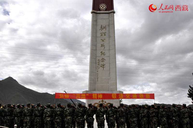 圖為2014年8月9日,武警交通官兵在位于拉薩的川藏青藏公路紀(jì)念碑前宣誓,紀(jì)念川藏青藏公路通車60周年。圖片來源:人民網(wǎng)