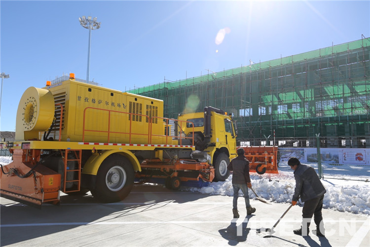 圖為工人在鏟除停機坪區(qū)域的積雪。