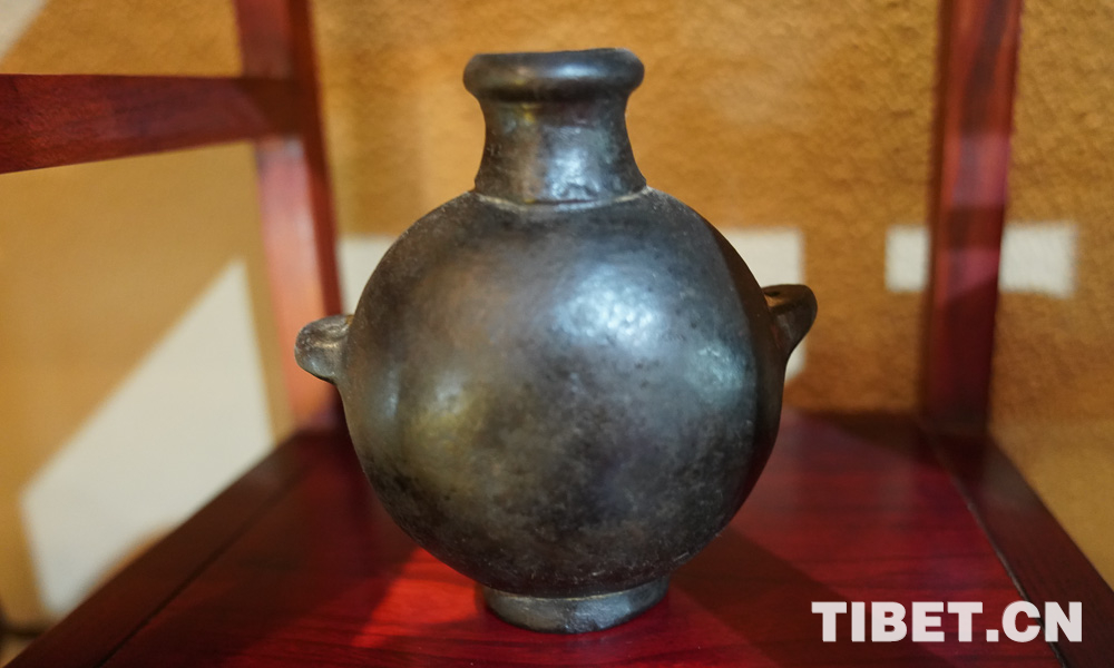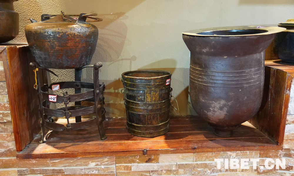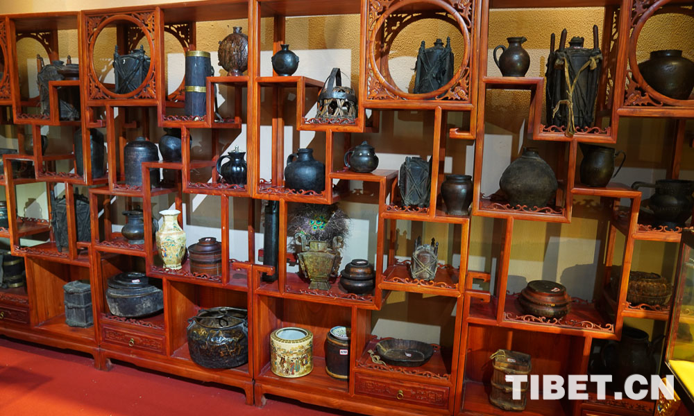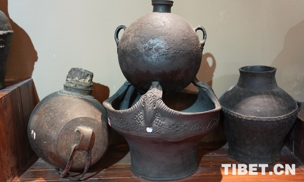 展品展示了川西高原上藏民族的生活生產用品、黑陶燒制技藝、唐卡繪畫技藝、金屬鍛造技藝、南派藏醫(yī)藥、水磨糌粑器具、牛羊毛編織技藝等。圖為民俗博物館展品。攝影:王淑。