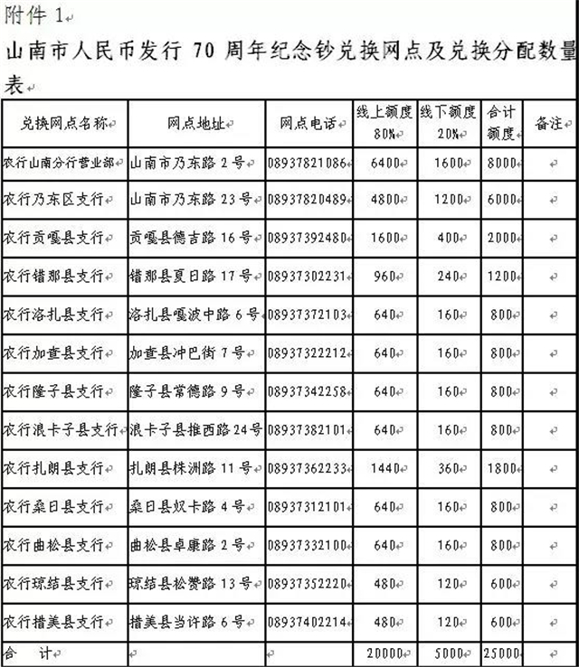 圖為山南市預約發(fā)行兌換網(wǎng)點及分配方案 圖片來源:中國人民銀行山南市中心支行