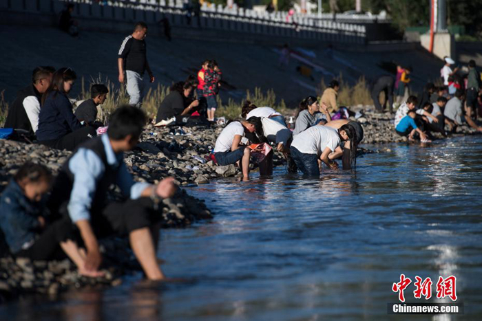 圖為沐浴節(jié)期間,藏族民眾在拉薩河邊沐浴。圖片來(lái)源:中新網(wǎng),攝影:何蓬磊