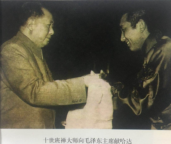 圖為十世班禪向毛澤東主席敬獻(xiàn)哈達(dá)。 圖片翻拍自《班禪額爾德尼評(píng)傳》