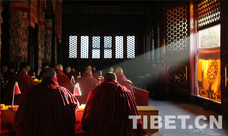 圖為僧人端坐于宗喀巴大師像兩側誦經(jīng)。