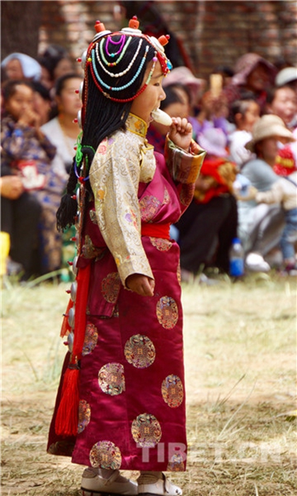 幼年的女孩和已婚女性、老年婦女皆是場外的觀眾,但是也都是精心裝扮、身著藏裝藏飾,美得含蓄而沉靜。我的眼睛不時地被她們的光彩照亮。