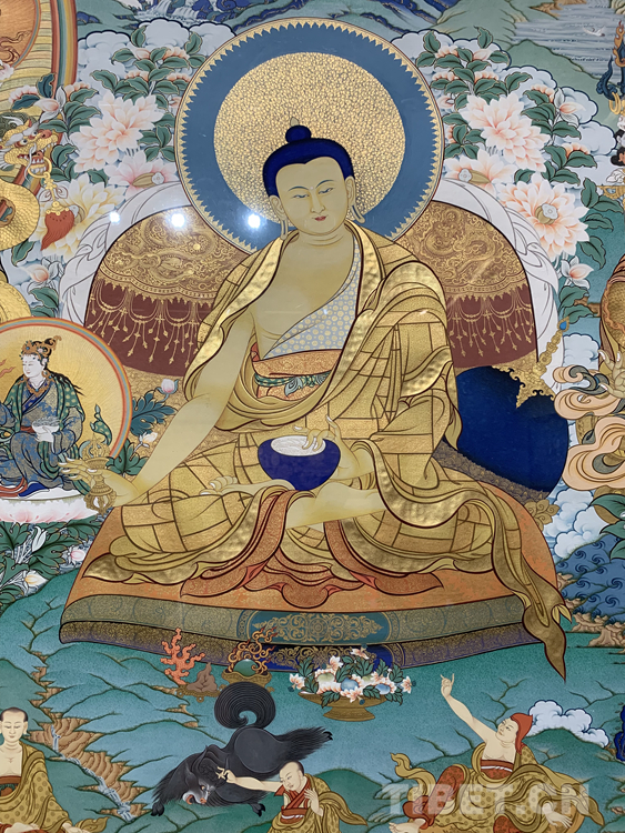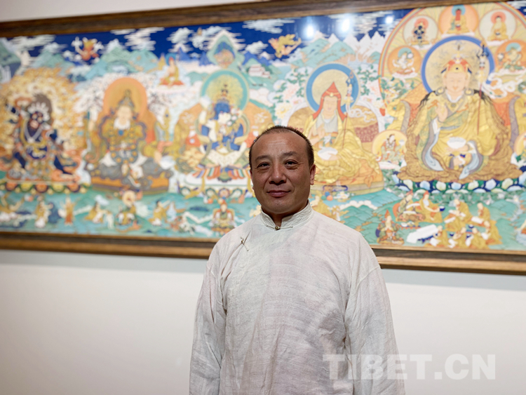 很多人對唐卡并不陌生,但對一幅唐卡是怎么被畫出來的卻是一知半解。唐卡的內(nèi)容大多來源于佛教里的經(jīng)文,里面有詳細(xì)的文字描寫,佛的穿著,顏色的搭配,甚至是佛們佩戴的首飾、拿的法器都有明確且詳細(xì)的記錄和與描寫。藝術(shù)家還需要有豐富的想象力和創(chuàng)造力,要有很強(qiáng)的構(gòu)圖能力,最重要的是要遵照《度量經(jīng)》等佛教儀軌,正規(guī)的去畫?!皠?chuàng)作一幅唐卡不容易,藝術(shù)家必須要懂佛教的文化、儀軌,懂《度量經(jīng)》,再加上藝術(shù)家自己的藝術(shù)創(chuàng)造能力,才能夠畫好一幅唐卡,這需要藝術(shù)家的綜合能力?!蹦锉纠^續(xù)說:“起稿、涂色、暈染、拉金線、拉線條等每一步驟都是在考核藝術(shù)家自身的能力,藝術(shù)家自己要不斷地學(xué)習(xí):學(xué)習(xí)佛教文化,了解文化的內(nèi)涵,藝術(shù)家需要更多地把心思投入到唐卡,并提高自身的藝術(shù)造詣才能夠畫好一幅唐卡?!?/p>