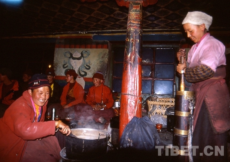 紅英是在昌都長大的藏族人,她跟我說起了一段她在內地念大學時的往事?!拔胰サ絻鹊睾炔坏郊亦l(xiāng)的酥油茶,整天就想啊想,后來有一次幾位藏族同學聚會,發(fā)現(xiàn)有人從家?guī)Я怂钟蛠?,大家如獲至寶,興奮的弄來一些茶葉,準備喝一頓饞了好久的酥油茶??墒?,沒有茶桶??!酥油要不斷攪拌才能融到茶水里,酥油和茶水融成的混合物再加上鹽才能叫“酥油茶”啊!