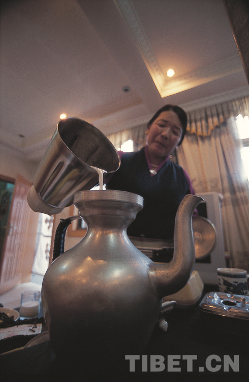 最具代表性的是酥油茶。酥油是從牛奶中提煉的粗制奶油,本來油水很難結合,但藏民族創(chuàng)造性地用反復攪制方法令二者水乳交融,從而使青藏高原有了最佳的飲品。酥油茶在不同地區(qū)也略有差別。