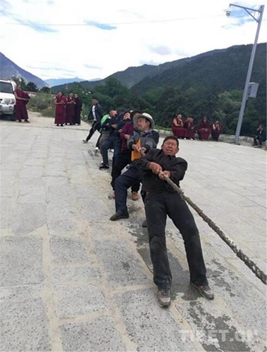 開展拔河比賽活動。由統(tǒng)戰(zhàn)民宗、工商聯(lián)干部、寺廟僧尼、珠曲登村村民、簡切村村民分別組成4支參賽隊(duì)伍,他們揮灑著汗水,在隊(duì)員們的加油鼓勁聲中賽出了力量,賽出了精神。
