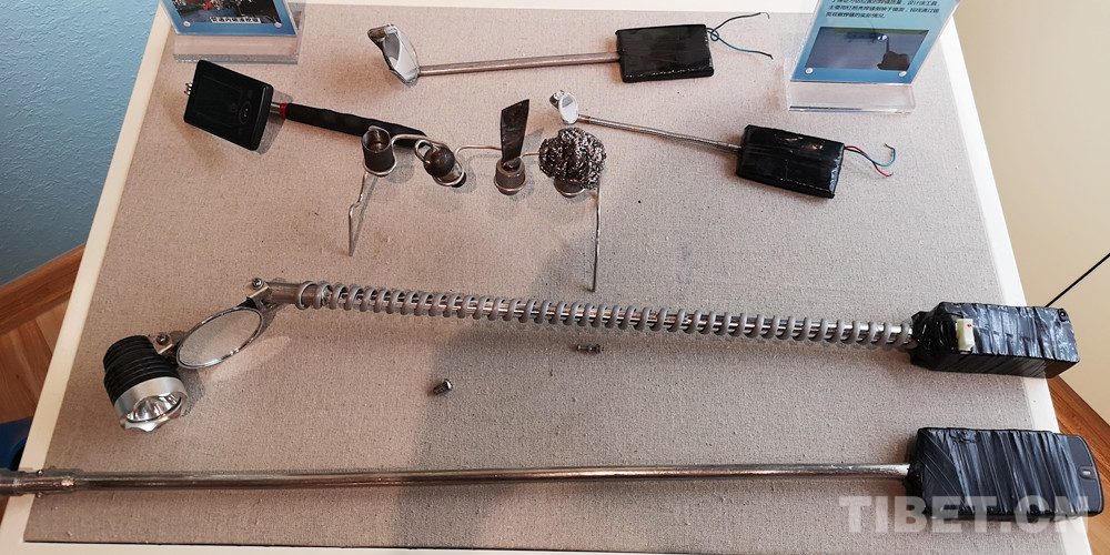 圖為楊永磊設(shè)計(jì)的管道內(nèi)熔渣挖取工具(圖上部三個(gè))、焊縫外觀檢查工具(圖下部兩個(gè)),前者能以鏟、掃、粘或吸的方式將管道內(nèi)熔渣清理干凈,后者以燈照亮焊縫倒映于鏡面,便于觀察刁鉆位置焊縫的實(shí)際情況 攝影:李元梅