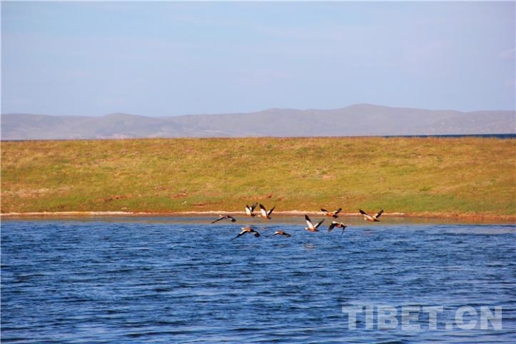 圖為鄂陵湖上水鳥飛過 攝影:王茜