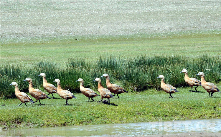 這是國家二級保護動物赤麻鴨(黃鴨)在申扎草原河邊“漫步”。(唐召明2009年8月9日攝)
