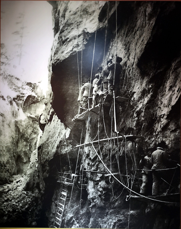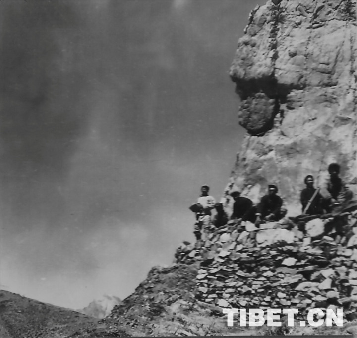 圖為懸空打炮眼。在峰巒險(xiǎn)峻的雀兒山開(kāi)鑿石方,全靠人工用鋼針打眼、放炮。翻拍:李元梅