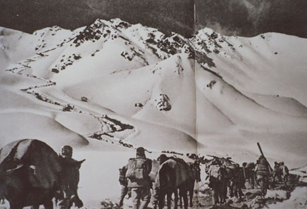 圖為進(jìn)藏部隊(duì)過(guò)冰河、翻雪山,奮勇前進(jìn)。翻拍:李元梅