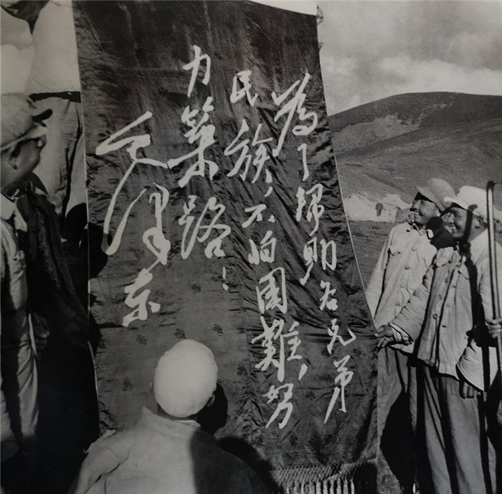 圖為毛主席的偉大號(hào)召——“為了幫助各民族兄弟,不怕困難,努力筑路!”鼓舞著指戰(zhàn)員們參加修筑公路的戰(zhàn)斗意志。翻拍:李元梅