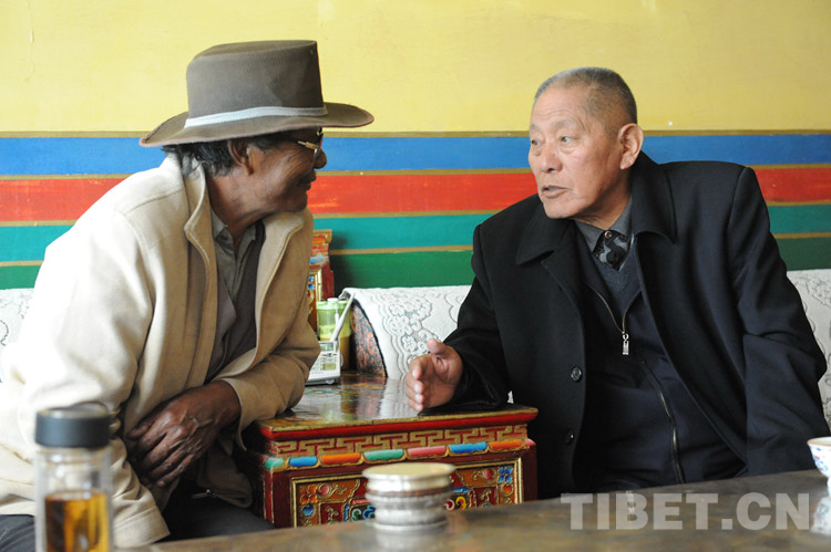 圖為當(dāng)年率領(lǐng)申扎縣牧民群眾開發(fā)藏北無(wú)人區(qū)的傳奇英雄、原西藏人大常委會(huì)副主任洛桑丹珍(右),專程來(lái)到嘎措鄉(xiāng)白瑪家中,看望當(dāng)年一同開發(fā)藏北無(wú)人區(qū)的鄉(xiāng)黨委書記白瑪(左)(2013年7月27日)攝影:唐召明
