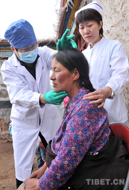 曾為斯求卓瑪進(jìn)行手術(shù)的北京口腔醫(yī)院頭頸腫瘤科主任韓正學(xué)(左)上門來到班戈縣新吉鄉(xiāng),為斯求卓瑪做術(shù)后檢查(唐召明2015年7月14日攝)