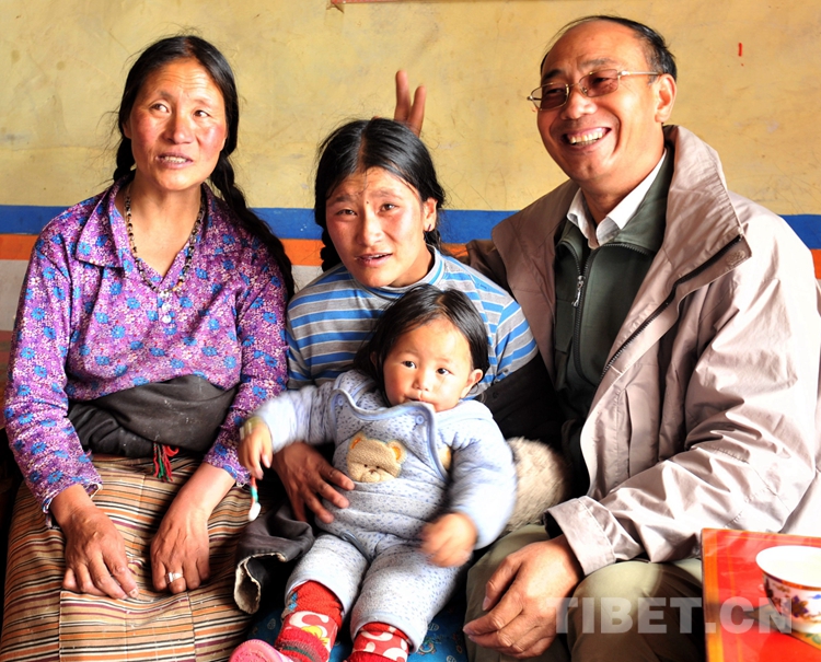唐召明看望他曾幫助治病的斯求卓瑪,并與住上新的安居房,抱上外孫,過上幸福生活的卓瑪一家人合影留念(唐召明提供,2015年7月14日攝)