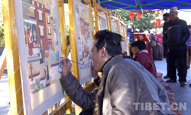 圖為唐卡畫師現(xiàn)場(chǎng)繪制寺廟消防安全唐卡 攝影:王媛媛