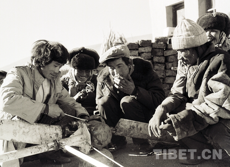 圖為那曲科委風(fēng)能實驗站技術(shù)工人余和平(左一)在嘎措鄉(xiāng)為牧民維修風(fēng)力發(fā)電機(jī)。(唐召明1988年11月24日攝)