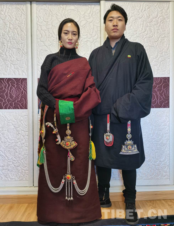 索南旦周最小的女兒叫梅朵,今年23歲,“梅朵”漢語(yǔ)意為“花朵”,她和她的名字一樣漂亮。她是索南旦周家里識(shí)文斷字的人。她的老公尕瑪才丁人高馬大,是典型的康巴漢子,他電大畢業(yè)后自主創(chuàng)業(yè),選擇靠祖?zhèn)鞯慕疸y首飾、佛像制造安身立命,在結(jié)古地區(qū)小有名氣。他打制的金銀首飾,精工細(xì)作,一絲不茍,真材實(shí)料,信譽(yù)度很好。他們主要接廠家和散戶訂制。梅朵兩口子不善言語(yǔ),而他倆一帥一美,藏裝上佩戴各式自己打制的金銀裝飾品,是最好的語(yǔ)言和廣告。(中國(guó)西藏網(wǎng) 通訊員/才仁當(dāng)智)