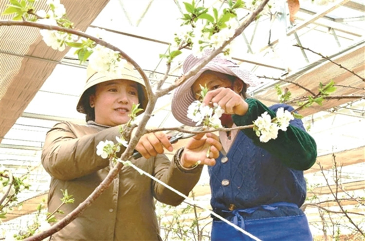 圖為當(dāng)?shù)貏?wù)工人員搶抓農(nóng)時(shí)為果樹(shù)疏剪花枝。 拉薩融媒記者 楊 璐攝