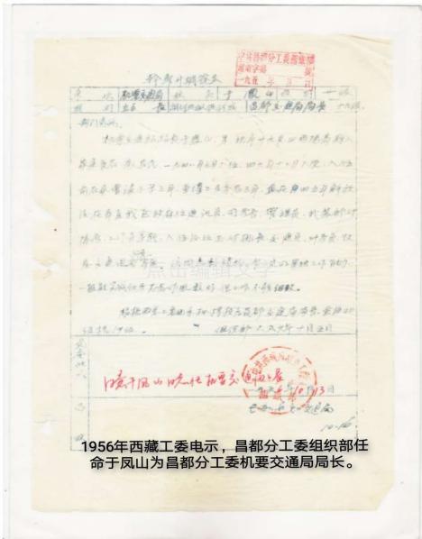在1956年全國(guó)轟轟烈烈的社會(huì)主義改造高潮中,西藏迎來(lái)了一個(gè)劃時(shí)代的日子,4月22日西藏自治區(qū)籌備委員會(huì)成立,領(lǐng)導(dǎo)人講話都提到了民主改革問(wèn)題。西藏工委在執(zhí)行中央“慎重穩(wěn)進(jìn)”的過(guò)程中,準(zhǔn)備在昌都、日喀則實(shí)行民主改革試點(diǎn)。因之接踵而來(lái)的是擴(kuò)大機(jī)構(gòu)增加人員,進(jìn)行大力宣傳和試點(diǎn)。父親負(fù)責(zé)的昌都分工委機(jī)要交通站也在擴(kuò)充之列,由機(jī)要交通站擴(kuò)充為機(jī)要交通局,直屬昌都分工委領(lǐng)導(dǎo)。在西藏工委電示下,昌都分工委組織部下文任命父親為機(jī)要交通局局長(zhǎng),周孝山為副局長(zhǎng),從1956年10月16日走馬上任。母親非常清楚地記著機(jī)要交通局除了上面提到的幾位,還有陶躍忠、王佳廉、唐俊生、韓進(jìn)先、鄭海超等近20多位從事機(jī)要交通的同志。