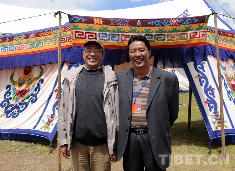 這是唐召明(左)與時(shí)任那曲縣縣長(zhǎng)扎南(右)在那曲賽馬會(huì)的帳篷前合影留念(唐召明提供,2009年8月12日攝)