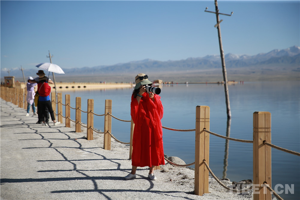 圖為游客正在拍攝,紅色是茶卡鹽湖景區(qū)里最醒目的顏色 攝影:楊月云