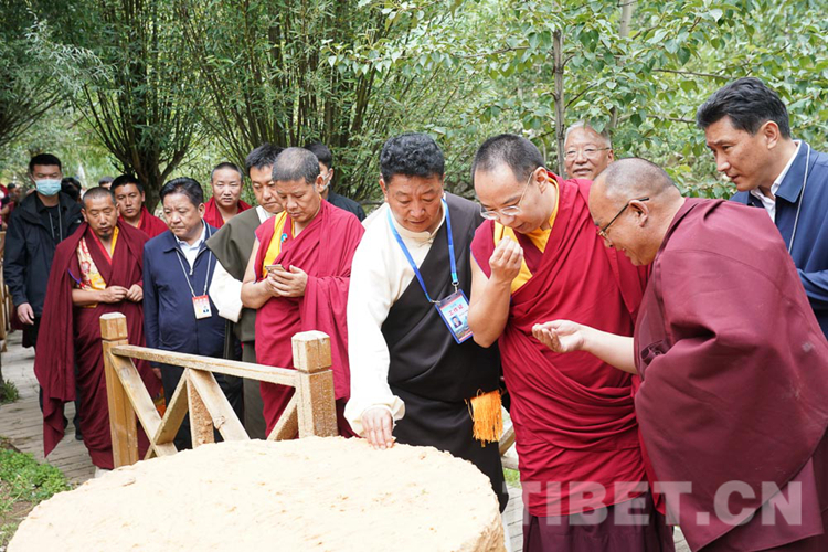 圖為十一世班禪在吞達村藏香制作園內察看研磨好的藏香原材料 攝影:王淑