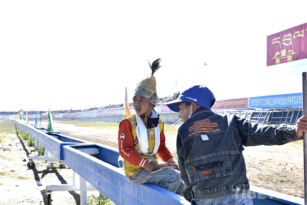 看了兩組比賽后,三兄弟奔跑到集合地點,要準備比賽了。看著哥哥拉巴桑珠和達瓦頓珠頭戴盔狀帽子、上穿黃色藏式上衣、手持竹把小鞭子,11歲的丹增久典滿是羨慕?!拔乙蚕腧T馬、去比賽,爸爸說還不到年齡。”