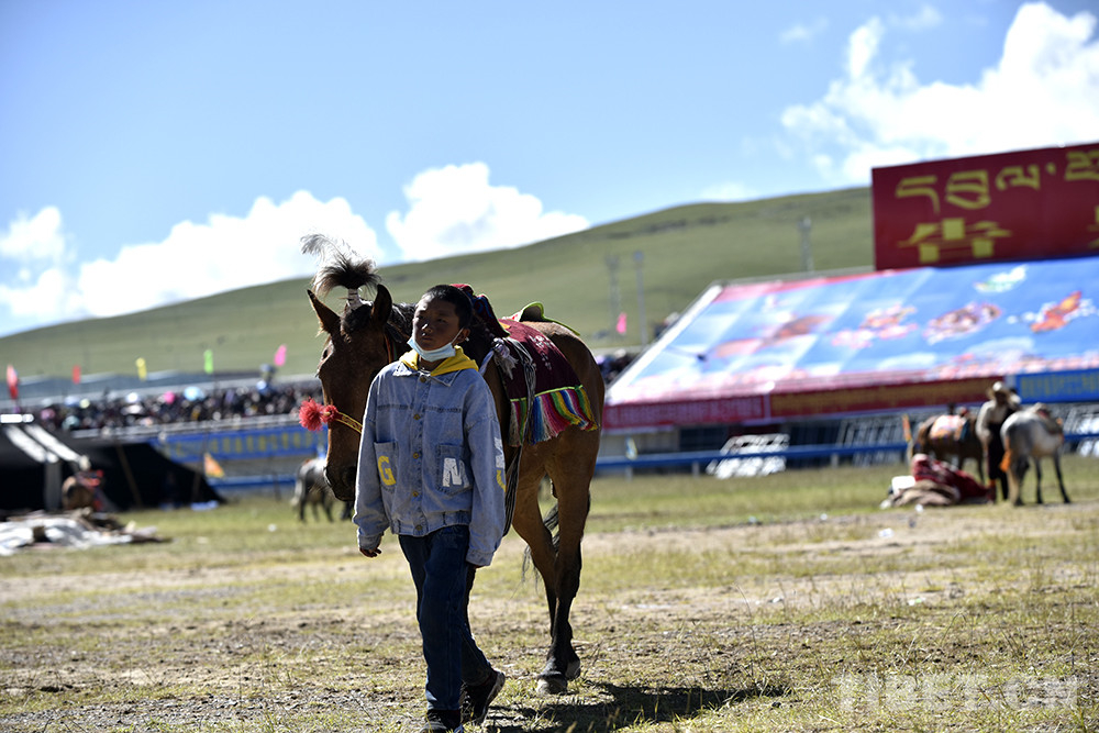 圖為西藏自治區(qū)那曲市2020羌塘恰青格薩爾賽馬藝術節(jié)場內(nèi)速度賽馬比賽現(xiàn)場,一位少年牽著馬兒 攝影:王媛媛