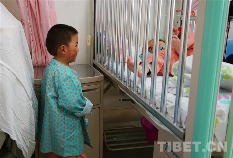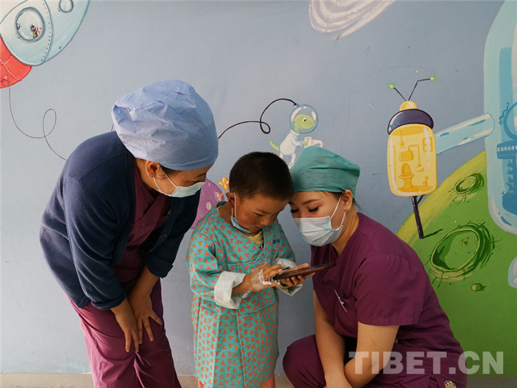 在記者采訪過(guò)程中,呷瑪龍刀尼瑪閑不住地跑來(lái)跑去,一會(huì)兒跑去看病友妹妹呷絨拉姆有沒(méi)有乖乖睡覺(jué),一會(huì)兒又拿起舅舅的手機(jī)刷小視頻,還熱情地分享給護(hù)士看。