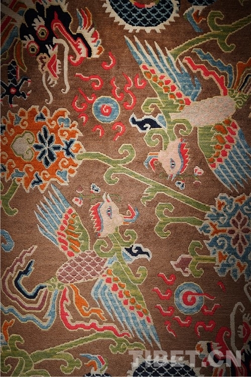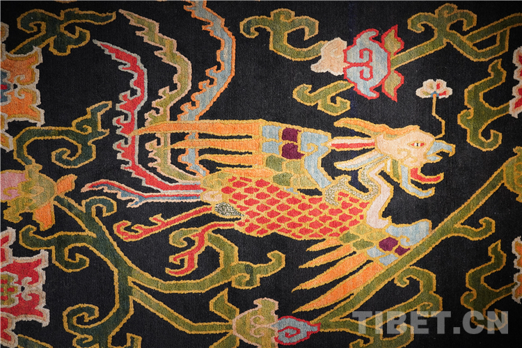 “本次展覽的藏毯,色彩搭配和編織都是技藝一絕,尤其是圖案寓意深遠,最具特色的是龍身鳳尾的龍鳳呈祥花紋非常精美。”介觀藝術(shù)中心的創(chuàng)始人徐應(yīng)龍介紹,“上半身為龍身,下半身為鳳尾,體現(xiàn)了多民族的文化交往交流交融。”