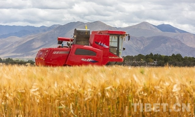 圖為收割機在青稞田里進行機械化作業(yè) 攝影:趙耀