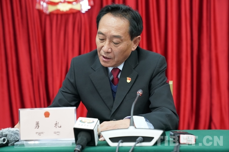圖為西藏自治區(qū)人大法制委員會副主任委員勇扎介紹有關情況 攝影:王淑