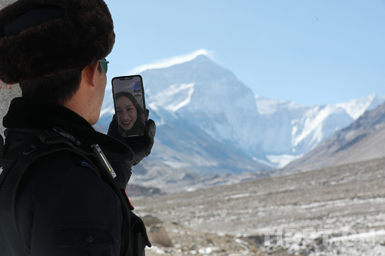 圖為王蘭波巡邏至珠穆朗瑪峰大本營,與家人視頻分享珠峰美景 攝影:彭維熙
