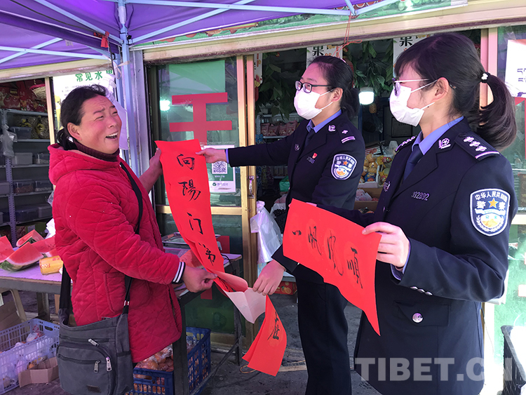 2月7日,拉薩邊檢站邀請拉薩市文聯(lián)書法家協(xié)會共同開展“同心同書——祖國新春好”送萬福進(jìn)萬家活動。4名書法家揮毫潑墨,書寫漢文藏文春聯(lián),散發(fā)著墨香的春聯(lián)凝聚著無限的祝福。隨后,邊檢站格?;ㄅ訄?zhí)勤隊民警為駐地商戶送“福”送春聯(lián)。在駐地的一家超市,商戶張大姐興高采烈地與民警一邊貼春聯(lián),一邊笑著說:“感謝你們送來的新春祝福。今年雖然沒能回家過年,但有你們的陪伴照顧,我們感到很開心?!?/p>
