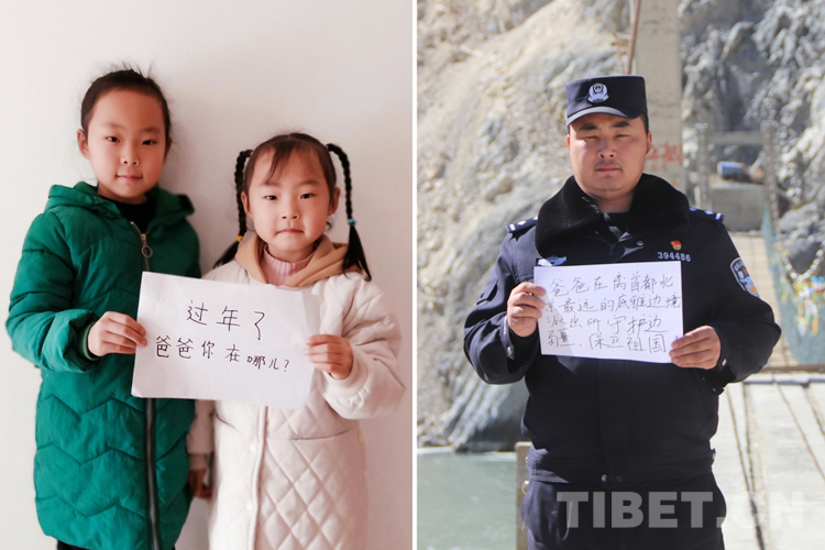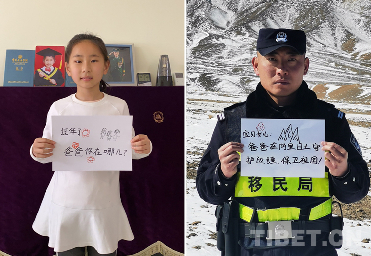 這是一張拼版照片,小女孩名叫旦增諾央,今年8歲,到現(xiàn)在還沒有和爸爸一起過過年。爸爸旦增尼瑪是日喀則邊境管理支隊亞熱邊境派出所所長,春節(jié)將至,他和戰(zhàn)友們堅守在海拔5300多米的中尼邊境一線,他通過這種方式表達對孩子的思念,相信慢慢長大的孩子一定能夠理解自己。