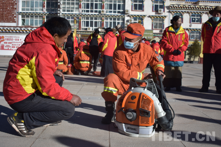 圖為左貢縣森林消防中隊駐芒康分隊指戰(zhàn)員耐心講解裝備使用方法
